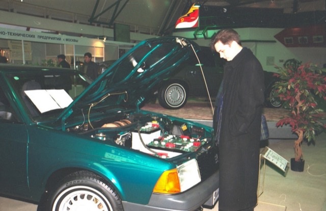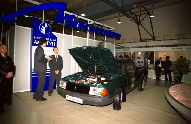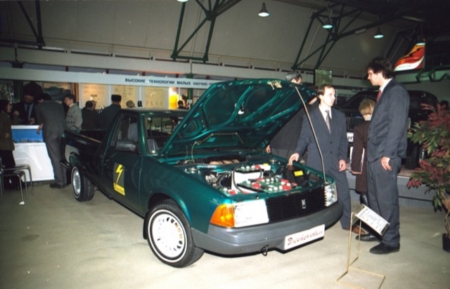 1997 год. Электромобиль АЗЛК-2335Е1 на автосалоне MIMS-97. Электромобили на базе моделей 2141 и 2335 были созданы АЗЛК при участии ГНПП "КВАНТ". В частности пикапов было построено 15 экземпляров, из которых 14 было списано и утилизировано в 2004 году. Один сохранили для музея.